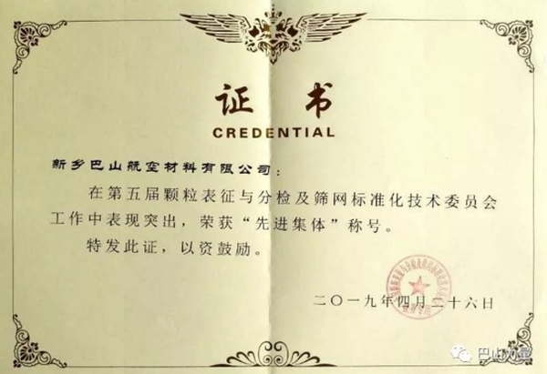 2019年5月,全國(guó)顆粒表征與分檢及篩網(wǎng)標(biāo)準(zhǔn)化技術(shù)委員會(huì)換屆暨六屆一次會(huì)議在江蘇常州召開,會(huì)上,巴山公司黨委副書記、總經(jīng)理白潛洋被聘為全國(guó)篩標(biāo)委副主任委員,并代表巴山公司參會(huì)。巴山公司作為GB/T6003.1、GB/T6003.2的主要起草單位,GB/T17492的參與起草單位,在全國(guó)顆粒表征與分檢及篩網(wǎng)標(biāo)準(zhǔn)化技術(shù)提升中表現(xiàn)突出,具有較強(qiáng)的影響力及引領(lǐng)作用,在此次大會(huì)中獲得“**集體”稱號(hào)。